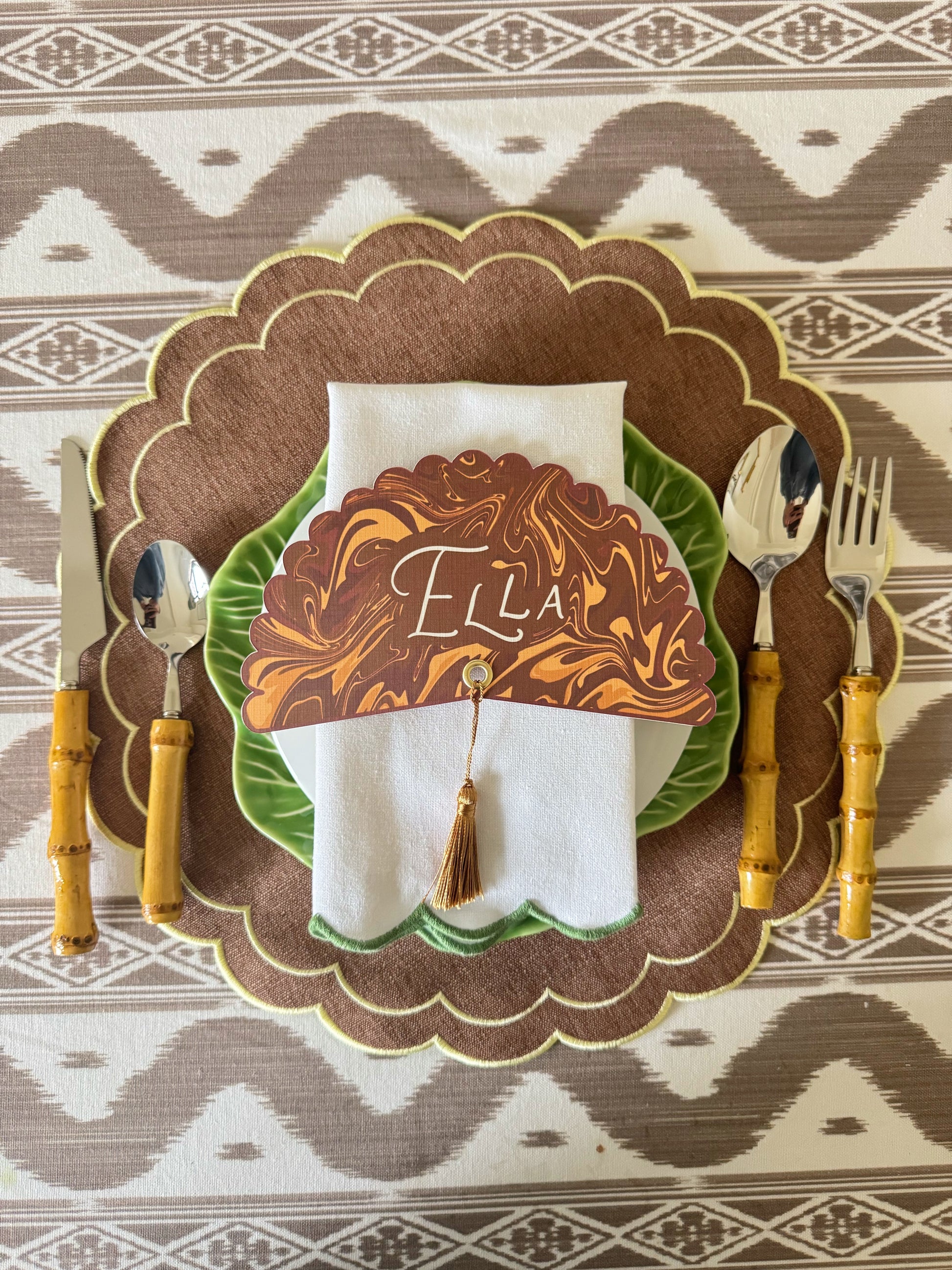Inspired by the timeless elegance of Italian marbled paper, these stunning plate rounds add an elevated, artistic touch to your holiday table. Each piece is double-sided and crafted on thick, textured paper, finished with a gold grommet and coordinating tassel for that perfect finishing touch.