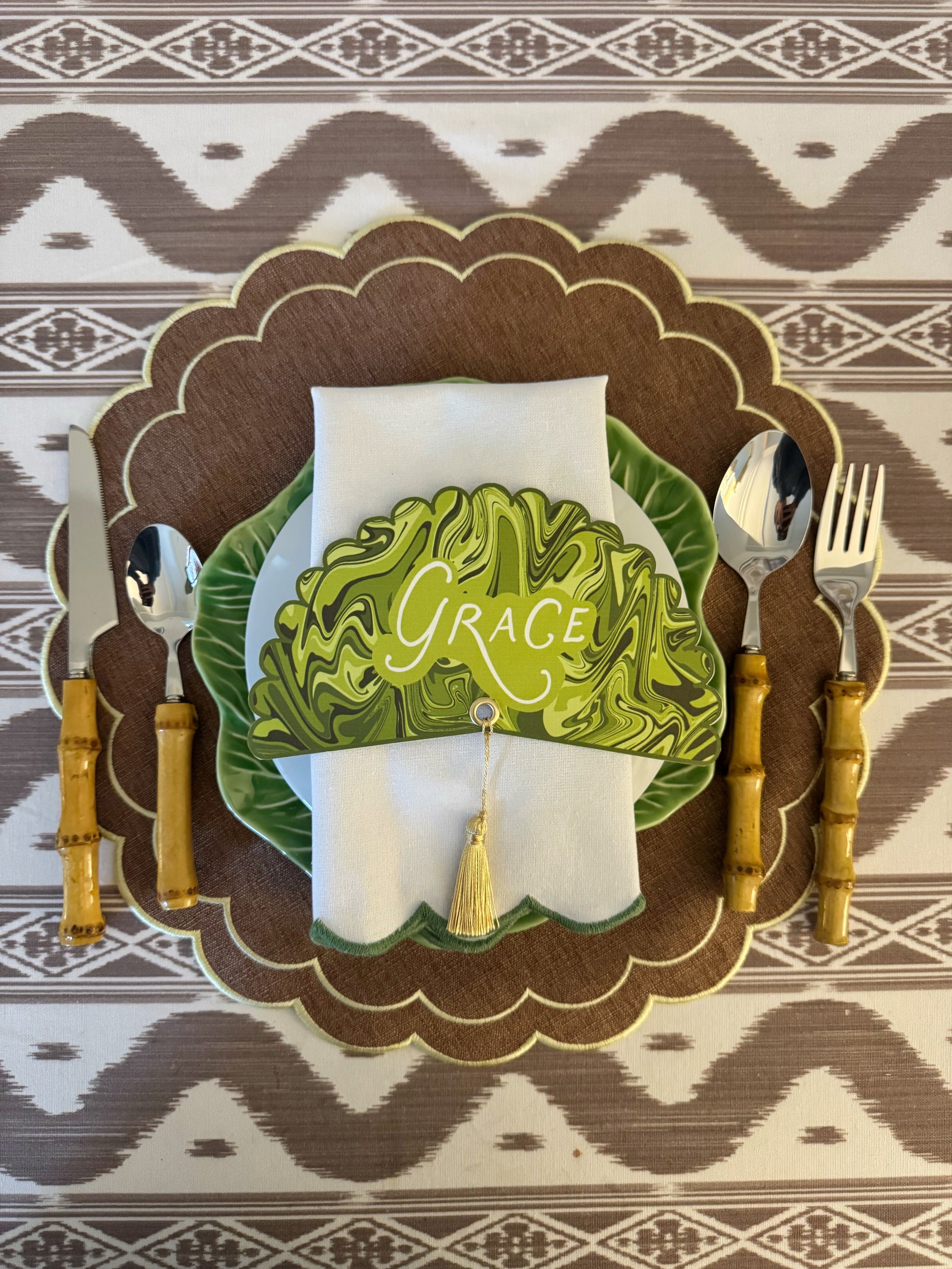 Inspired by the timeless elegance of Italian marbled paper, these stunning plate rounds add an elevated, artistic touch to your holiday table. Each piece is double-sided and crafted on thick, textured paper, finished with a gold grommet and coordinating tassel for that perfect finishing touch.